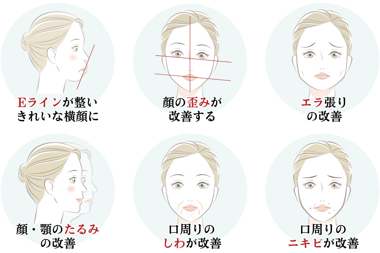 さらに、口周りの梅干しシワやニキビ、エラ張りの改善等も期待でき、患者さまが本来持っていた美しい顔立ちを取り戻すことにつながるのです。