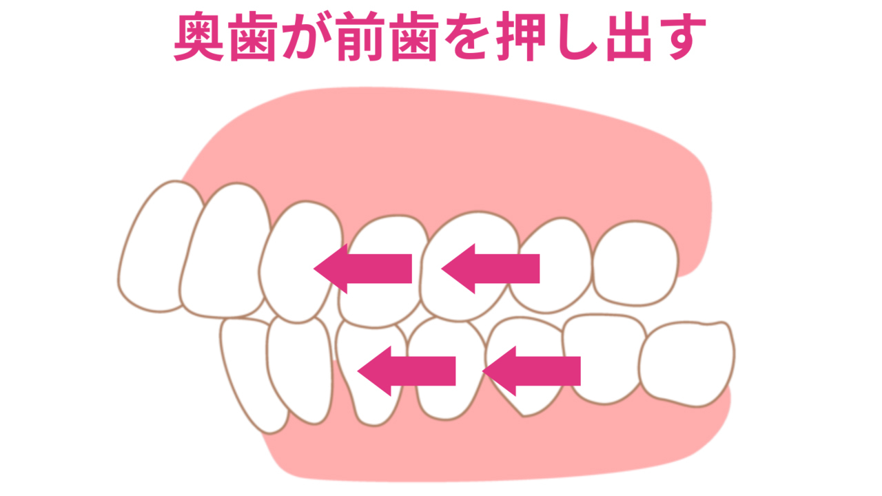 奥歯が斜めに生えていると、食べ物を噛む度に前歯を前方に押し出す力が働きます。